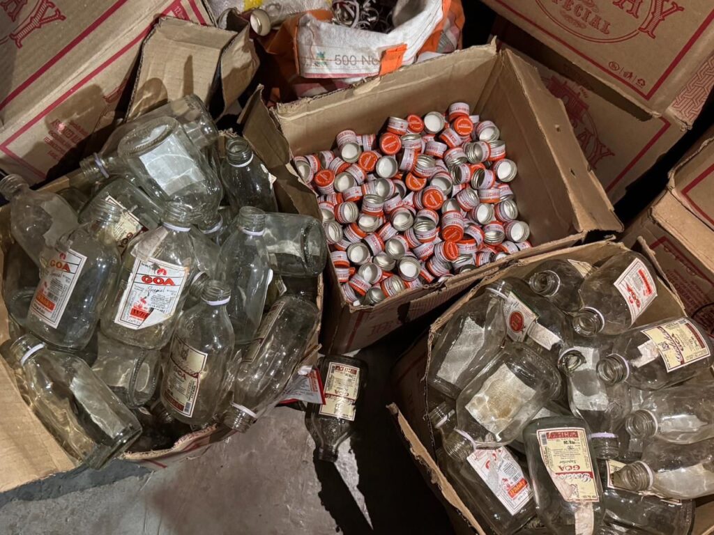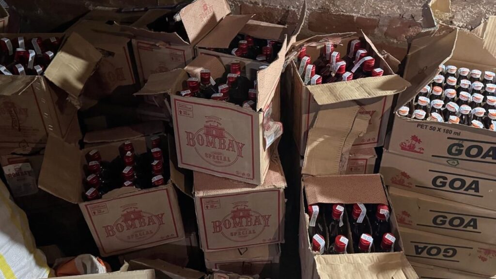 तलाशी में कुल 243 लीटर अवैध व्हिस्की बरामद हुई—264 बोतल बॉम्बे व्हिस्की (750 एमएल) और 250 पाव गोवा व्हिस्की (180 एमएल)। साथ ही री-पैकिंग का पूरा सामान: 200 खाली बोतलें (एमपी लेबल), 500 खाली पाव (छत्तीसगढ़ लेबल), 220 टूटे ढक्कन और 715 साबुत ढक्कन।